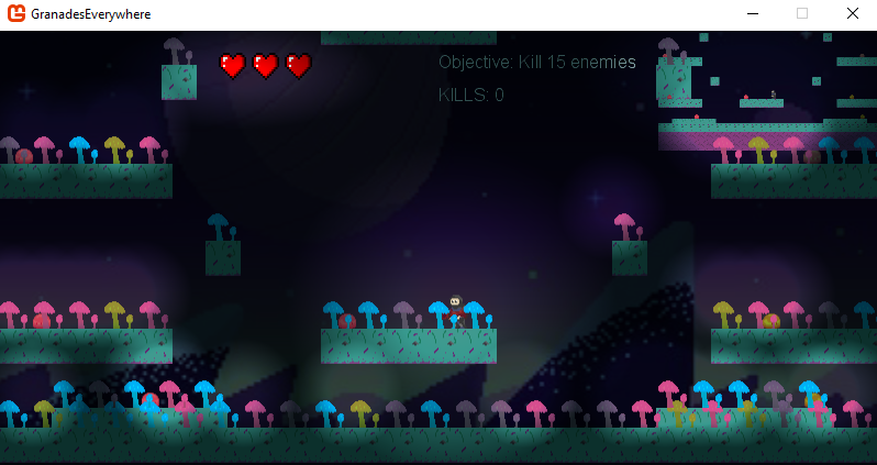 My first attempt at making a game was a duo-developed game called Grenades Everywhere. Since I am very interested in the world design I tried to bring my vision of the game to life with handmade sprites and dimmed lighting. I also dipped my toes into simple UI.
